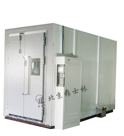 室體(試驗室主體(殼體))分為六個室體面及一扇雙開式室體大門,尺寸為1800×2000 mm,室體材料為內膽優質不銹鋼板(防止長時間在濕度運行狀態下內壁生銹),外膽為優質彩鋼板(國內名牌),保溫介質為聚氨脂硬質發泡隔熱,質輕耐抗擊,隔熱性能佳,大門材料同樣為彩鋼板制成,大門拉手為內外開啟式,以便于試驗人員從封閉的室內自由開啟大門。